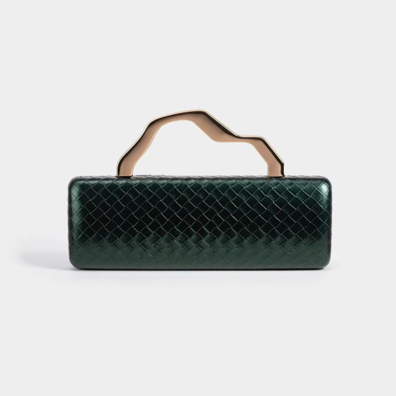 Ce sac est une pochette de soirée tressée avec une poignée dorée sculpturale, souvent commercialisée sous des noms tels que « East-To-West Metallic Bag » ou « MNBVUIW Women Trendy Woven Evening Bag ». Elle est généralement fabriquée en cuir PU (cuir synthétique) de haute qualité avec une texture tissée sophistiquée.