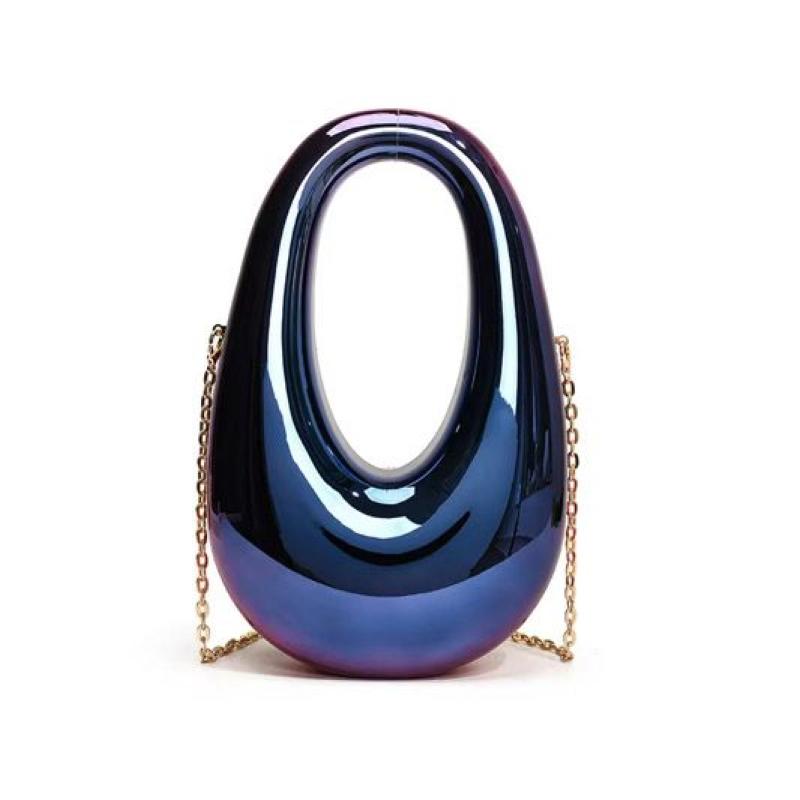 Ce sac à main est un modèle ovale en acrylique brillant avec une bandoulière en chaîne dorée. Son design minimaliste et sa finition métallique en font un accessoire populaire pour les tenues de soirée et les looks tendance de style "Y2K".