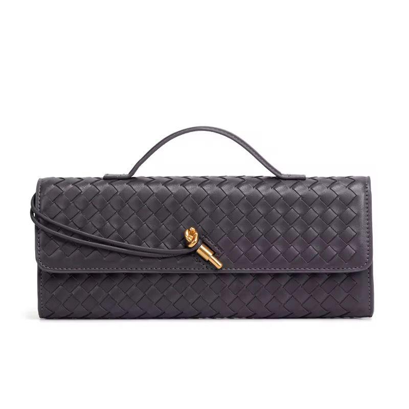 Cette pièce est la pochette Long Andiamo de la maison de luxe italienne Bottega Veneta.Elle se distingue par le tissage Intrecciato emblématique de la marque et un fermoir métallique en forme de nœud doré.