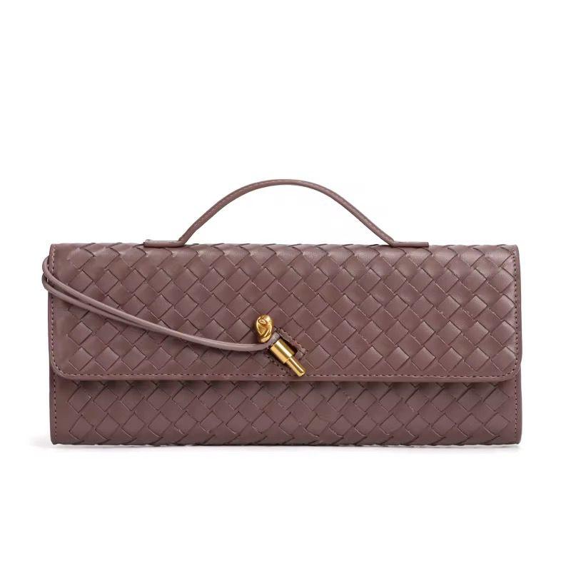 Cette pièce est la pochette Long Andiamo de la maison de luxe italienne Bottega Veneta.Elle se distingue par le tissage Intrecciato emblématique de la marque et un fermoir métallique en forme de nœud doré.